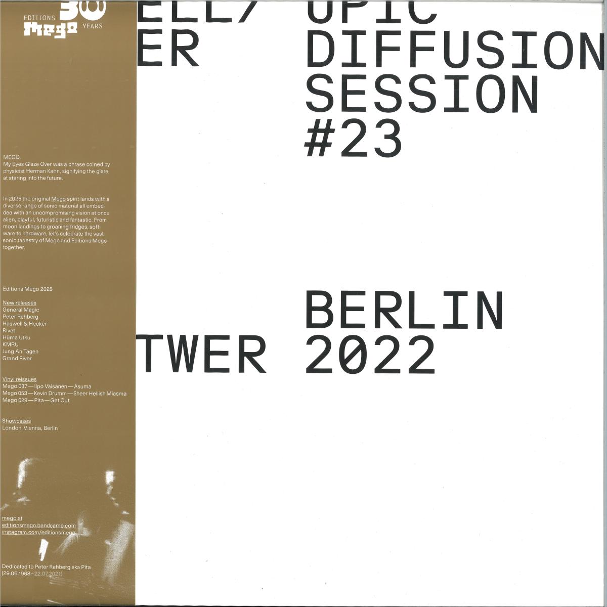 Russell Haswell and Florian Hecker have both a long history with Mego/Editions Mego. Individual releases have peppered the Mego catalogue since Haswell’s Live Salvage 1997->2000 cd release (MEGO 012) in 2001 and the debut Hecker release IT ISO161975 (MEGO 014) in 1998.The individual exploration of sonic phenomena by these two practitioners has resulted in both being highly regarded for their uncompromising approach to sound as matter. Russell Haswell and Florian Hecker came together as a collaborative duo with the now-legendary record Blackest Ever Black, somewhat inexplicably, on the classical imprint of Warner Brothers.In 2025, Hecker and Haswell return with a new album featuring the two-channel edit produced initially for their UPIC DIFFUSION SESSION #23, performed as a live diffusion across 8-channels at the X100 Festival, Berlin, 2023, celebrating the 100th anniversary of Xenakis' birth.This record furthers the duo's exploration of Xenakis's UPIC system as the sole instrument. The UPIC is a computer music system that generates sound from visual input. The original intention of the system developed by Xenakis was to make a utopian tool for producing new sounds accessible to all, independent of formal training. One can locate footage of Xenakis and a group of children making drawings for the system in the 70's.The duo set off experimenting with a diverse array of hand-drawn images to feed the UPIC system including news photographs of disasters and atrocities, "food porn" through to depictions of the natural world and microscopic images of molecular structures (including 'the blackest ever black'). The resulting eccentric audio from these images is claimed by the artists to heighten synaesthesia and is as mysterious as it is baffling.Throughout UPIC DIFFUSION SESSION #23 frequency clusters move and morph in the most unusual manner, shifting and stretching into shapes that hint at some kind of magical process. What starts out deceptively simple soon unravels into a large array of sonic mayhem. Symbolic jet planes are shredded by a swarm of insects, a metal bowl howls into the void, a tiny tin toy crawls into a thicket with the resolute aura of a black hole. A burning geyser of laser forms liquid shrapnel. This is sound as an alchemical process, a constant chimerical flow into the netherworld and is the net result of the decades long radical investigations by the two artists involved. UPIC DIFFUSION SESSION #23 is a direct, rich and rewarding listen for those willing to invest time into the outer limits.